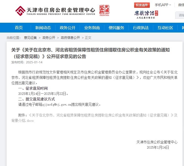 1月14日,天津市住房公积金管理中心网站发布关于《关于在北京市、河北省租赁保障性租赁住房提取住房公积金有关政策的通知(征求意见稿)》公开征求意见的公告,拟规定: